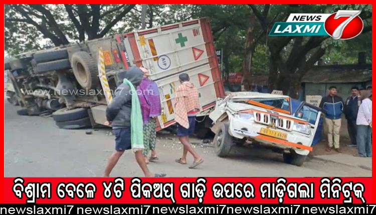 ସମ୍ବଲପୁର ୩୦।୧୧: : ୪ଟି ପିକଅପ୍ ଗାଡ଼ି ଉପରେ ମାଡ଼ିଗଲା ମିନିଟ୍ରକ। ବିଳମ୍ବିତ ରାତିରେ ରେଢାଖୋଲ ଭୀମଭୋଇ ଛକ ନିକଟରେ ଘଟିଛି ଏହି ଅଘଟଣ ।